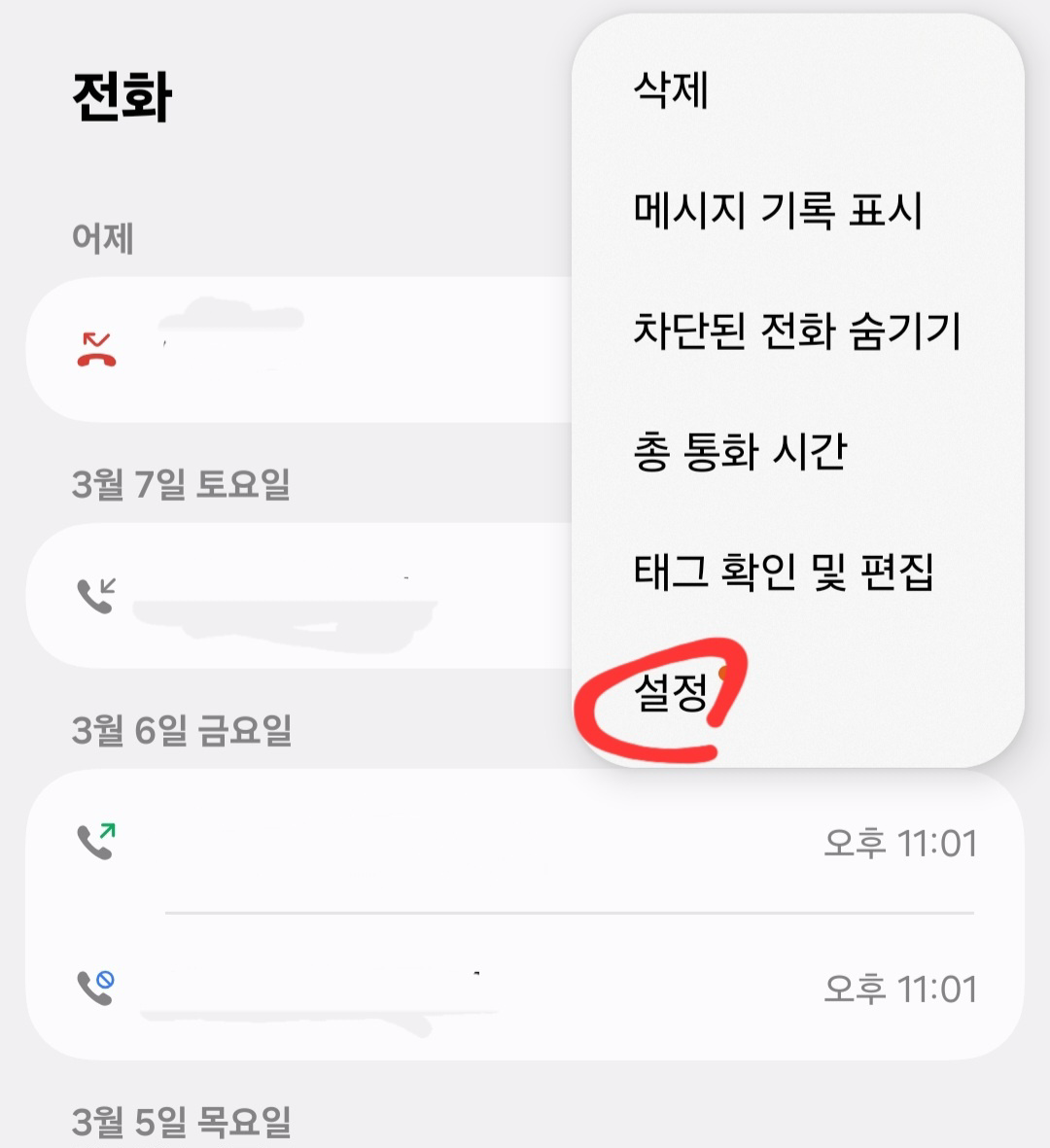 - Tip: 메뉴가 바뀌어도 전화 앱 안의 설정 아이콘은 대개 이 위치에 있습니다.