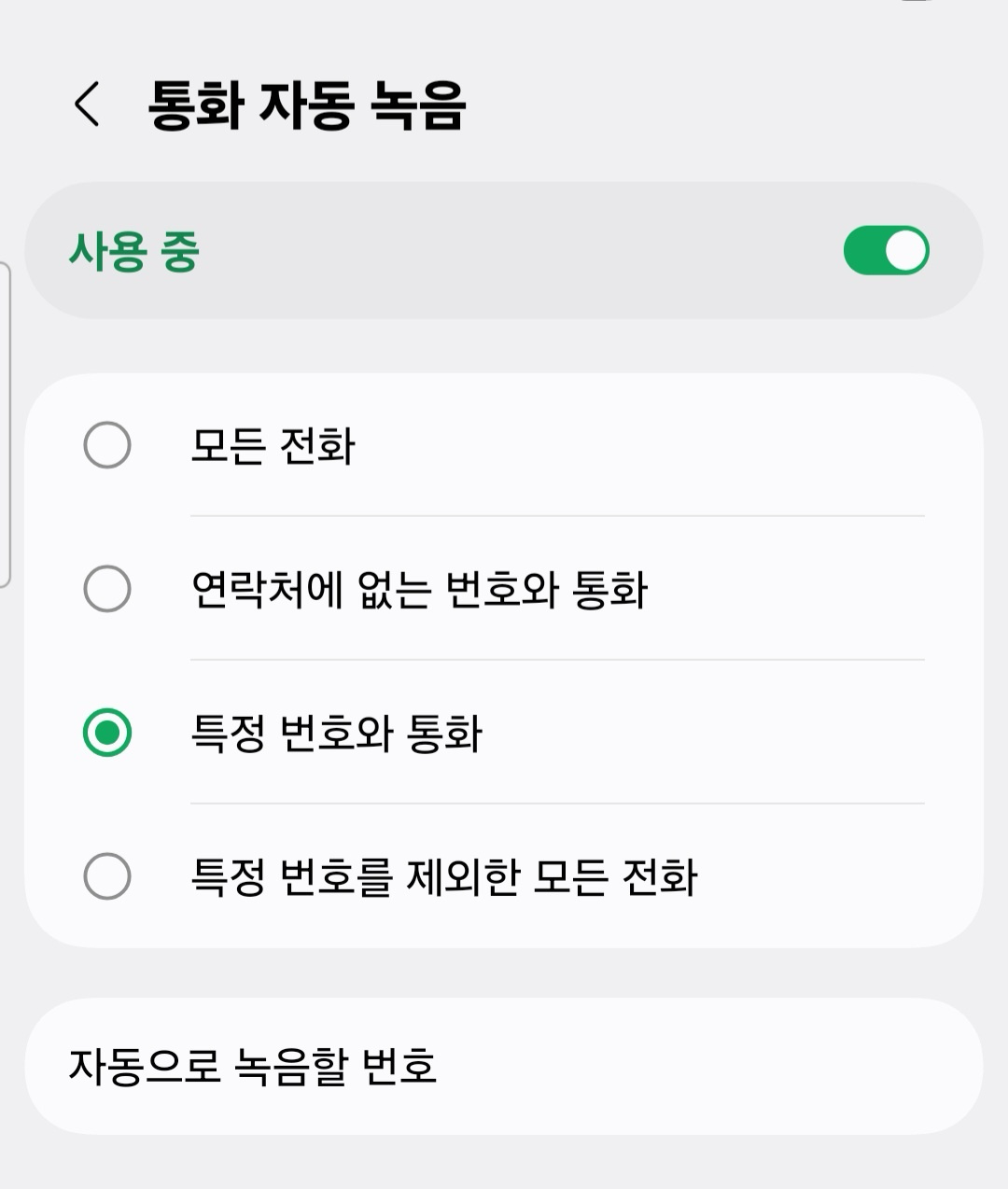 - 버튼을 누른 뒤에는 모든 번호를 녹음할지, 저장되지 않은 번호만 녹음할지 세부 선택이 가능합니다.
