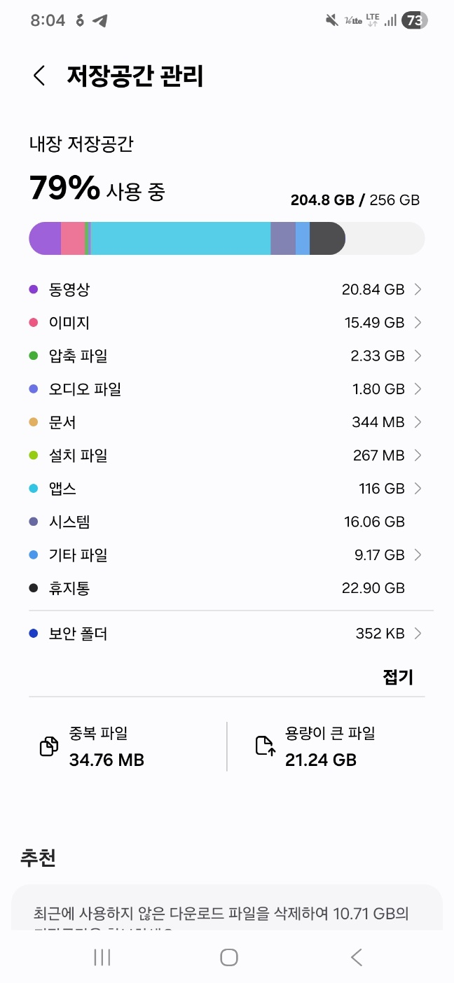 가장 큰 용량을 차지하는 것은 역시 사진과 영상입니다. 하지만 지우기만 해서는 용량이 바로 늘어나지 않아요.