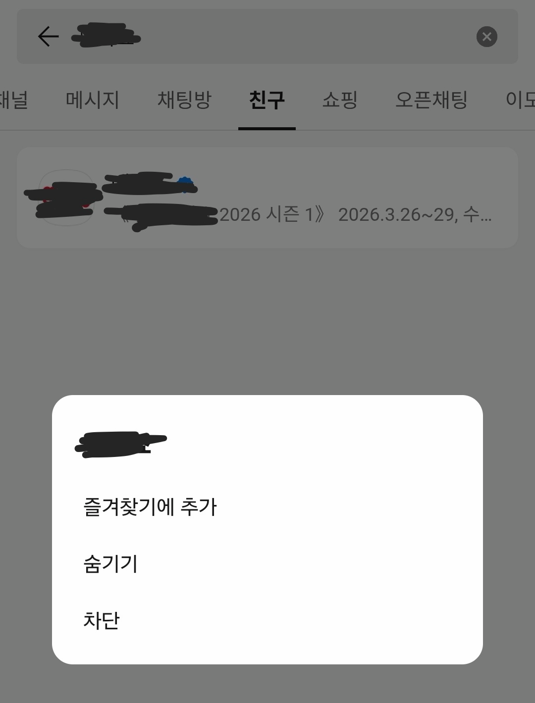 • 친구 목록에서 해당 채널을 길게 눌러 [숨김]을 선택하세요.