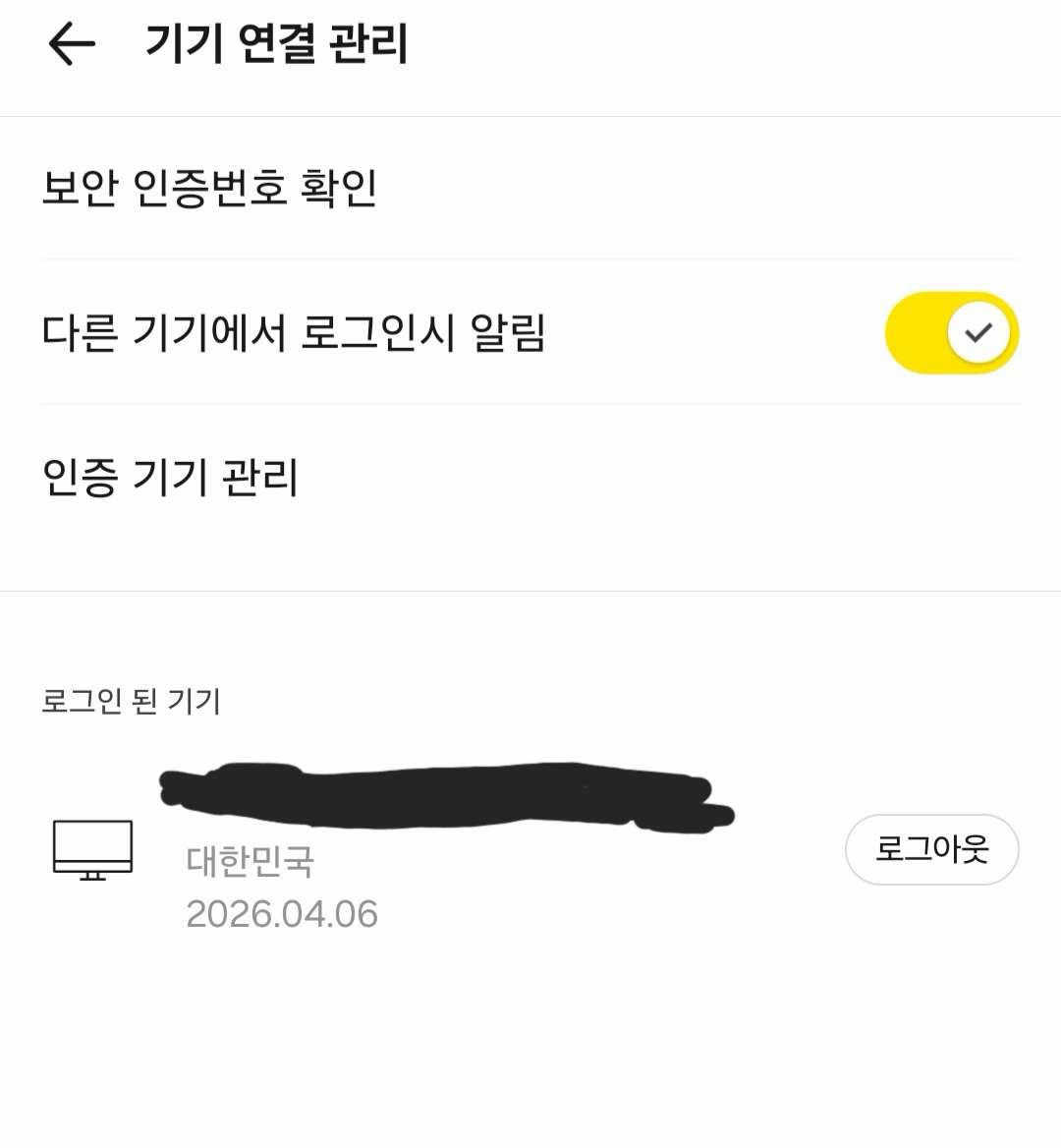 - 로그인 알림: [설정] → [개인/보안] → [기기 연결 관리] → [로그인 알림]을 '켜짐'으로 설정하세요. 평소 안 쓰던 브라우저나 기기에서 로그인하면 즉시 카톡 메시지가 옵니다.