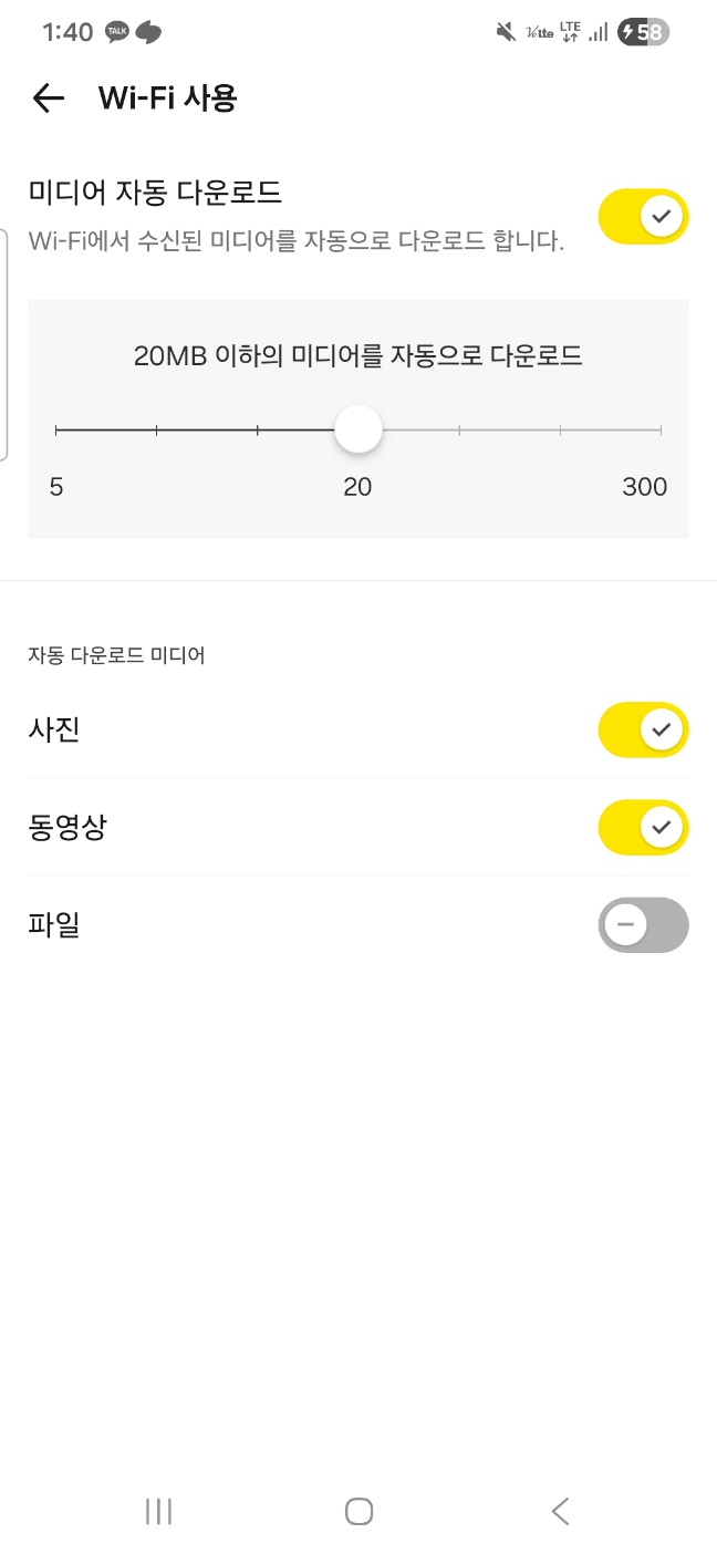 - Wi-Fi에서 미디어 자동 다운로드 켜짐