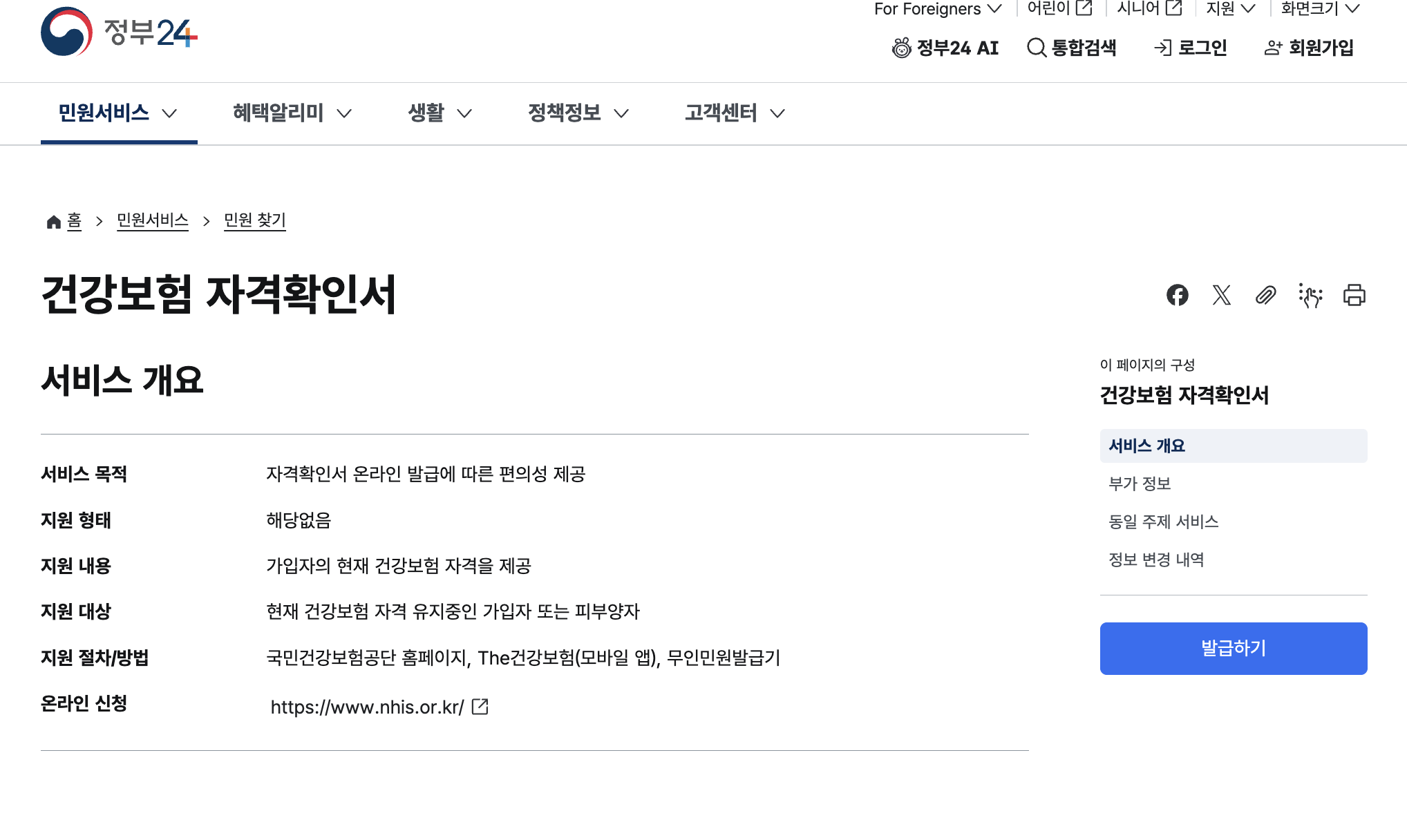 - 검색 결과에서 서비스 안내 문구를 확인한 뒤 발급하기 버튼을 클릭합니다.