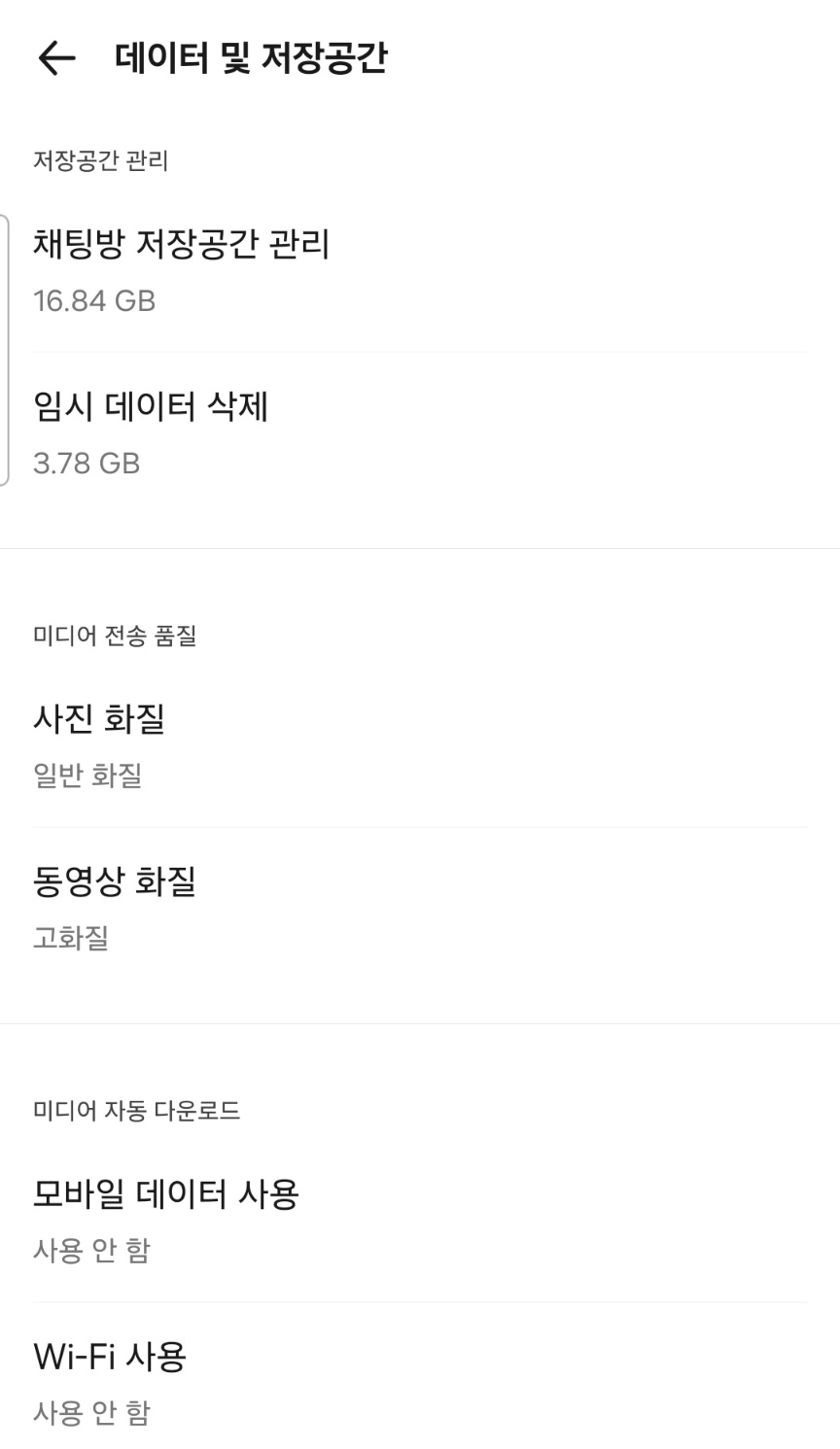 💡 주의사항 [미디어 데이터 전체 삭제]는 주의가 필요합니다. 채팅방에서 주고받은 사진/영상을 폰에 따로 저장하지 않았다면, 이 버튼을 누른 후에는 다시 볼 수 없게 됩니다.