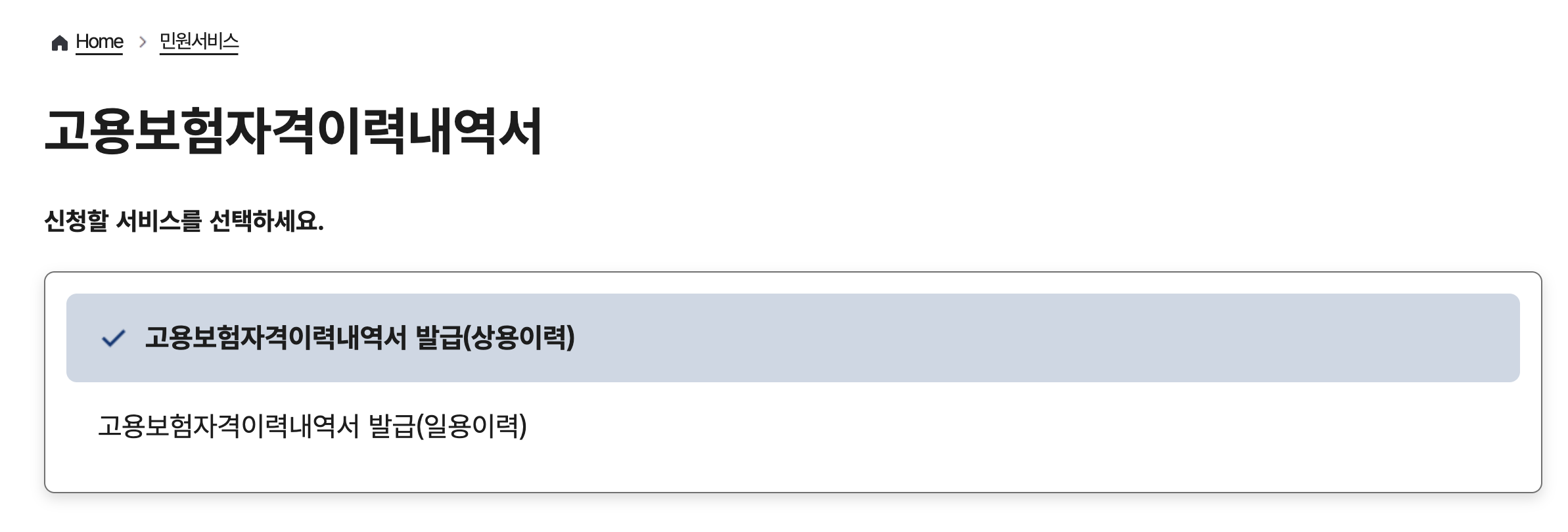 - 고용보험 자격이력내역서 선택: 민원서비스에서 검색하여 찾아보세요 누르세요.