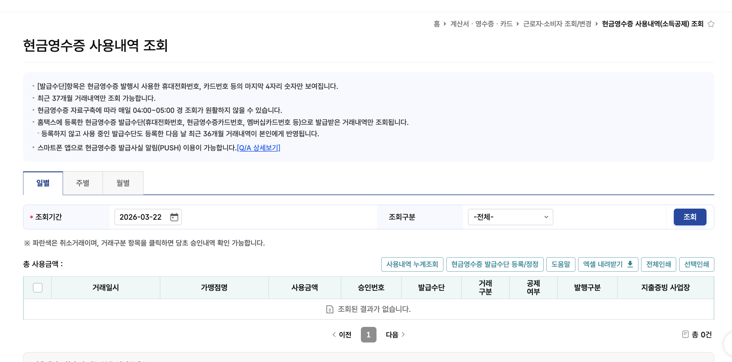 등록을 마쳤다면 하루 이틀 뒤에 [현금영수증 사용내역 조회] 메뉴에서 내역을 확인해 보세요.
