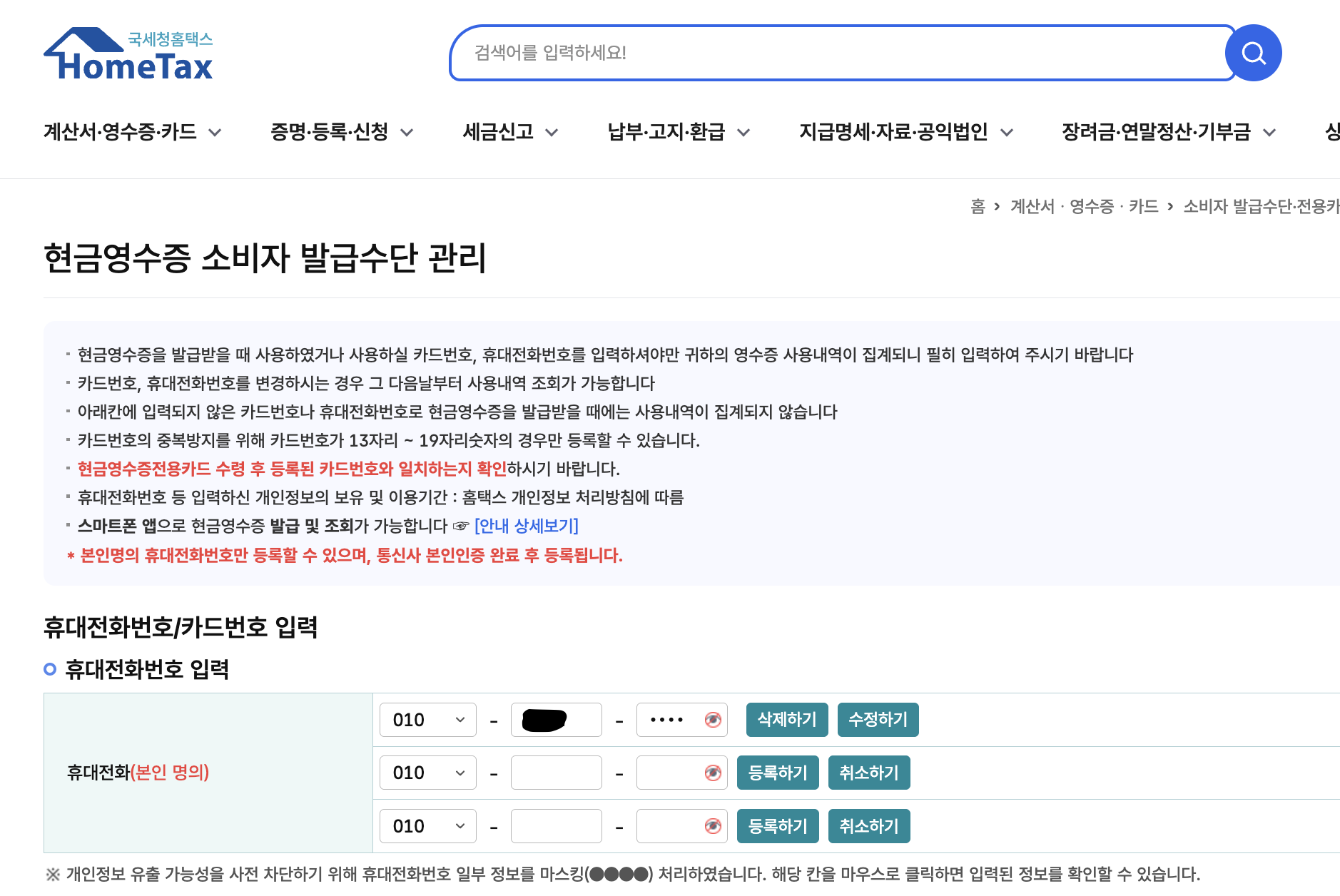✅ 한 줄 요약 [계산서/영수증/카드] → [현금영수증] → [소비자 발급수단 관리] 순으로 접속하세요.