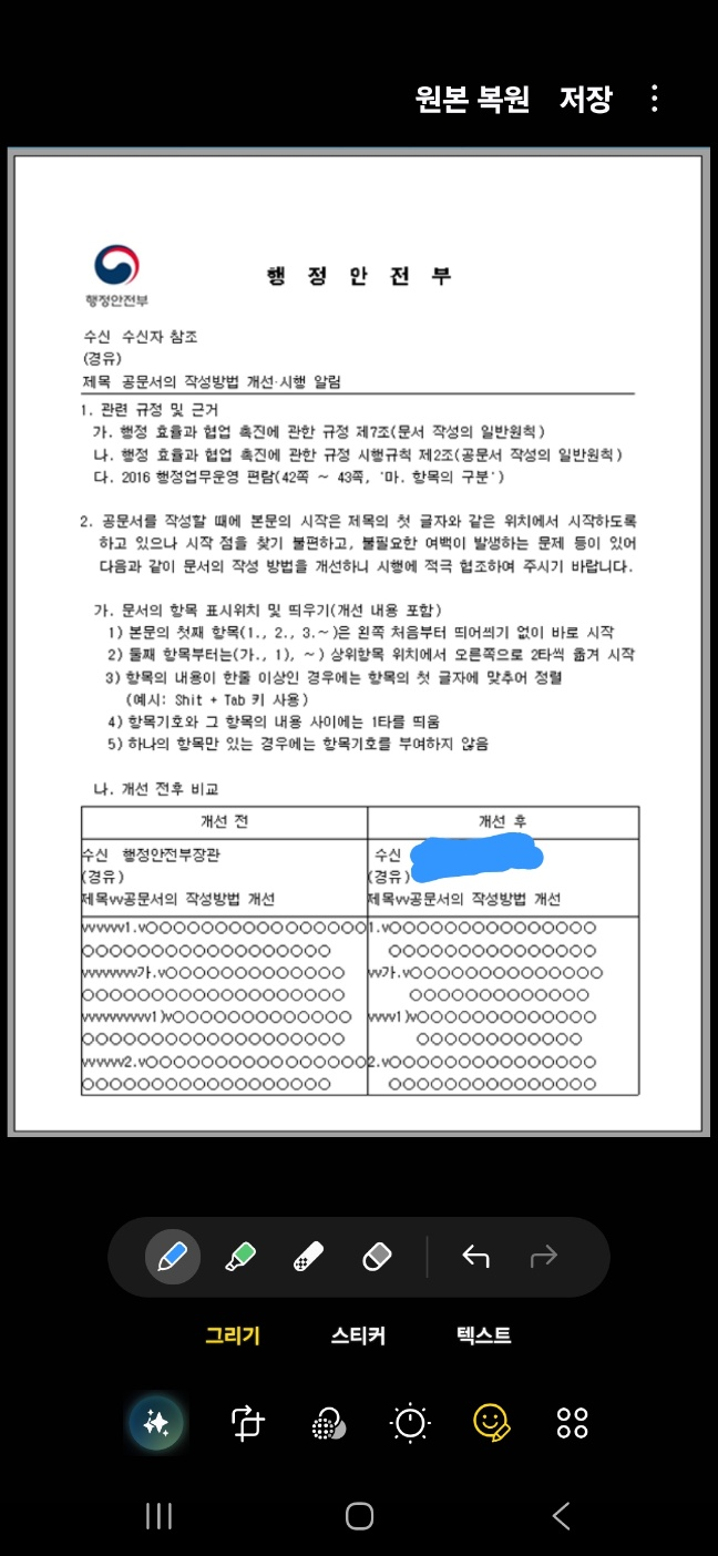 - 방법 B (PDF 편집 앱): 'Adobe Acrobat'이나 스마트폰 기본 PDF 뷰어의 '주석/그리기' 기능을 이용해 검은색 펜으로 덧칠한 뒤 저장합니다.